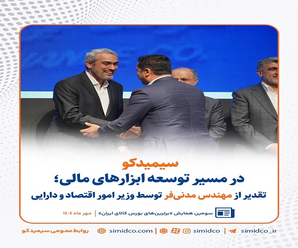 در آیین ویژه سومین همایش برترین های بورس کالای ایران با حضور وزیر امور اقتصادی و دارایی، از مهندس محمد مدنی فر، مدیرعامل سیمیدکو بهپاس نقش آفرینی اثرگذار این شرکت در گسترش ابزارهای مالی مبتنی بر کالا و راهاندازی معاملات گواهی سپرده کالایی تقدیر ,...